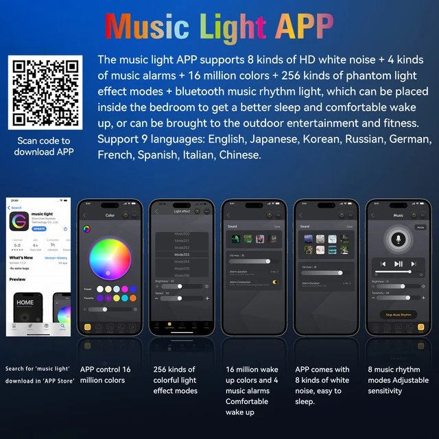 Customize your wake-up experience by adjusting sound, volume, light color, and brightness through the app, creating a personalized and healthy sleep routine.